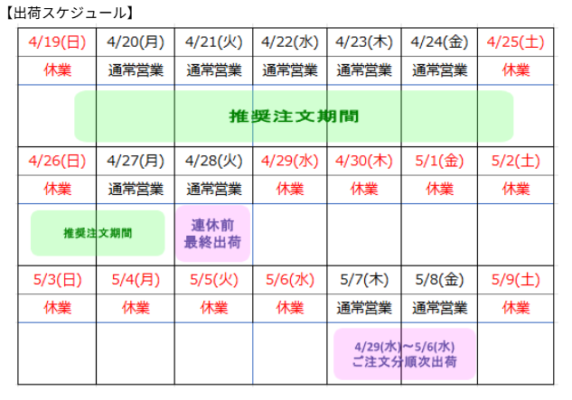 連休中の大量のご注文や、日付指定注文について対応できかねる場合もございますので、大変恐縮ですが連休前に余裕をもってご注文いただきますようお願いいたします。